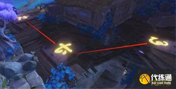 2、跟随【藤原俊子】来到一处房屋旁,通过启动安装在房屋闸门,按照【宝图】中右下角的顺序依次踩踏房屋周围的3处标有图案的木板。