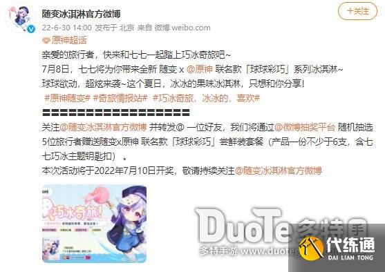 关注@随变冰淇淋官方微博 并转发@ 一位好友,我们将通过@微博抽奖平台 随机抽选5位旅行者赠送随变x原神 联名款「球球彩巧」尝鲜装套餐(产品一份不少于6支,含七七巧冰主题钥匙扣) 。