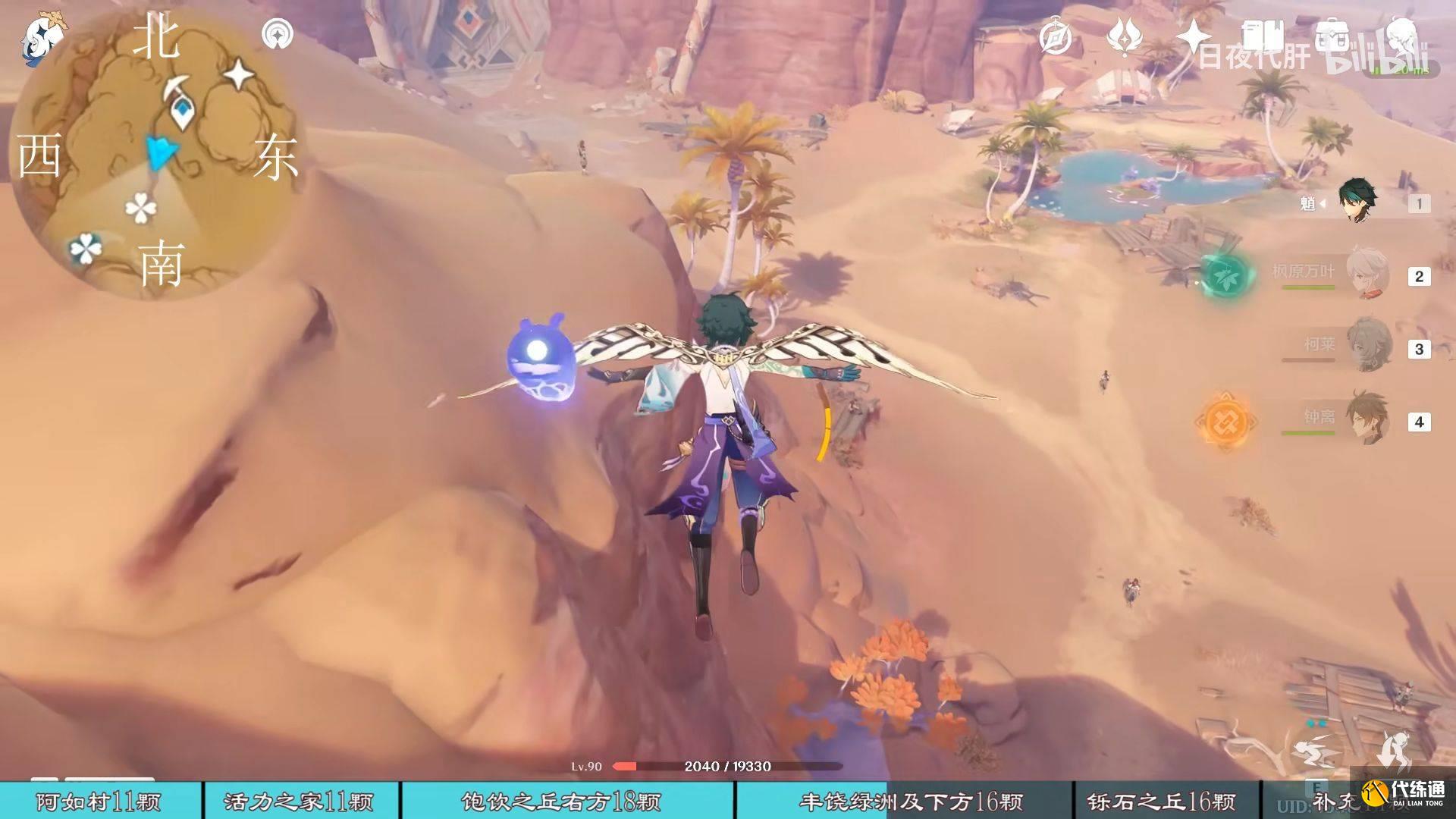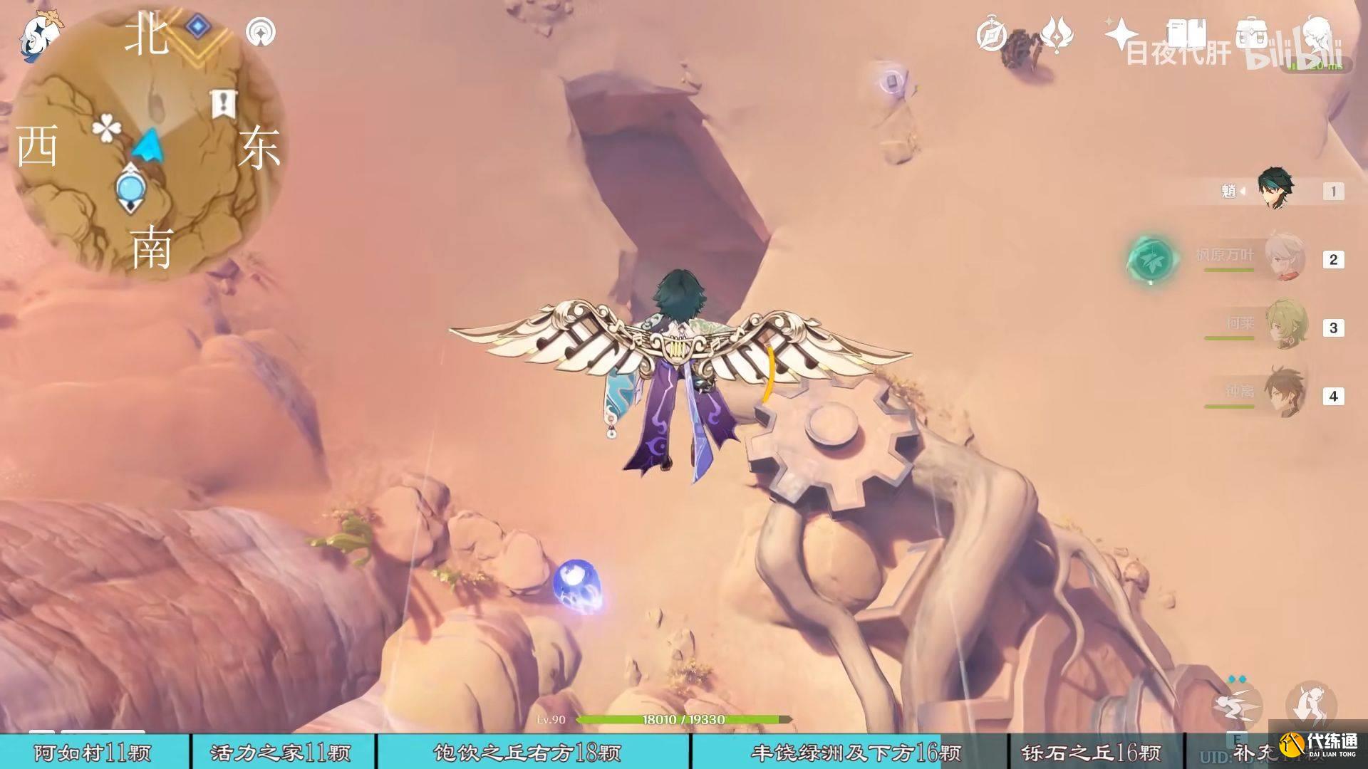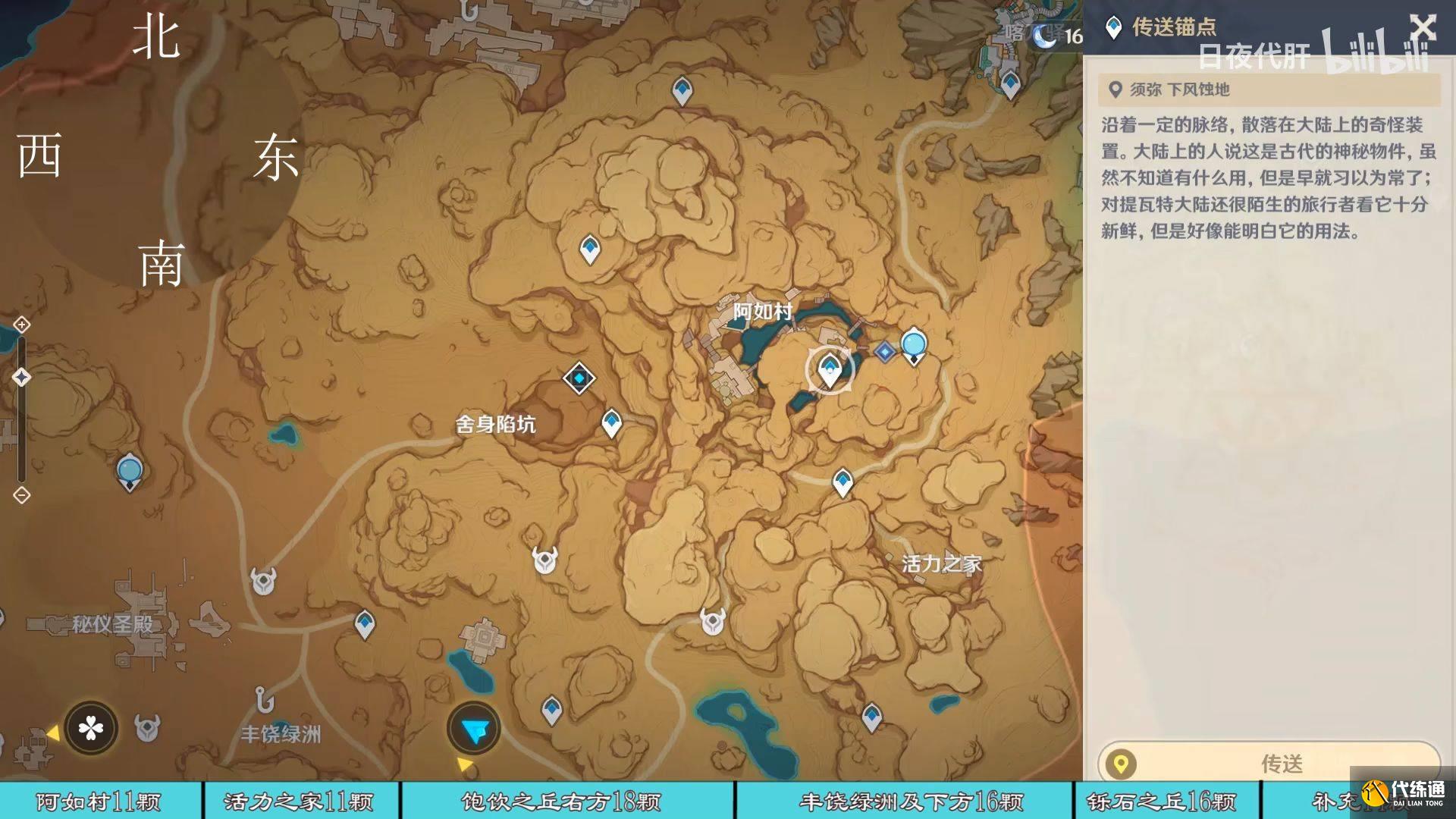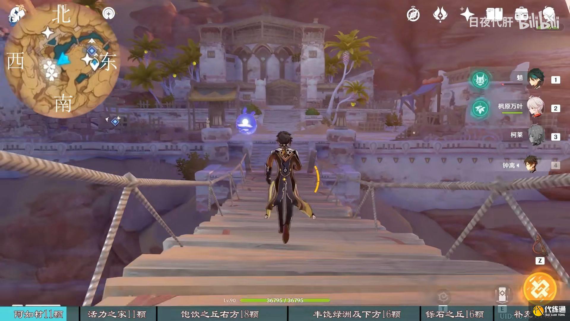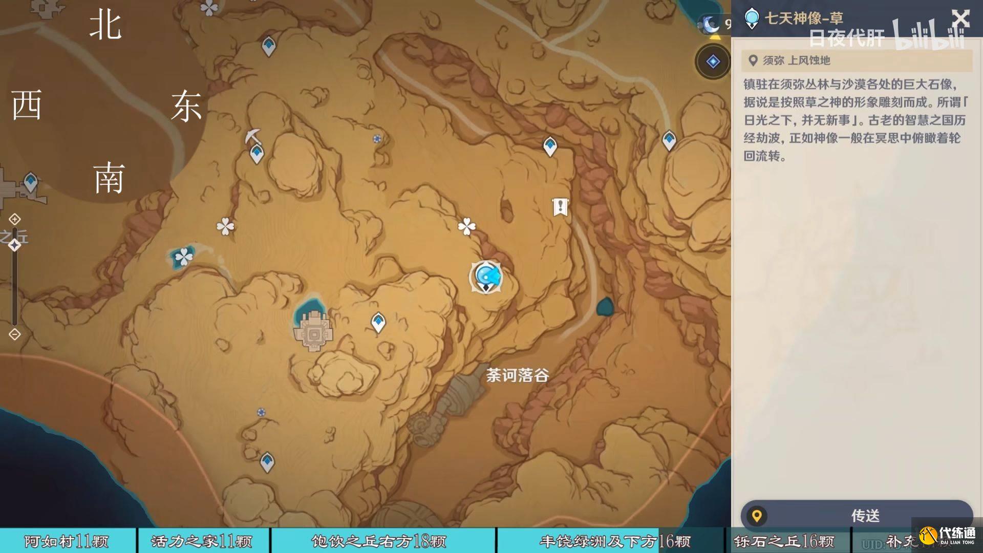 到饱饮之丘右下方的七天神像,西北方向走 用四印叶勾过去,北方向往上看有四印叶,勾过去。是个到左上绿洲的捷径。