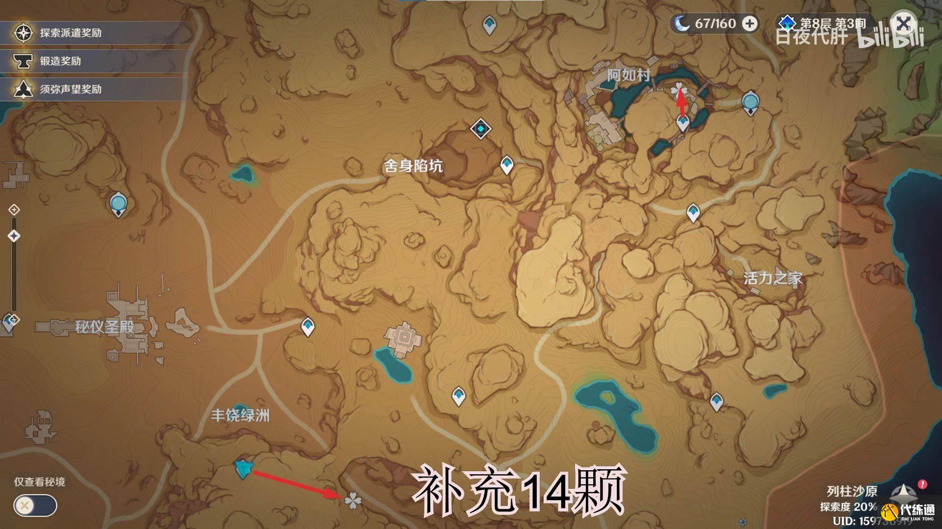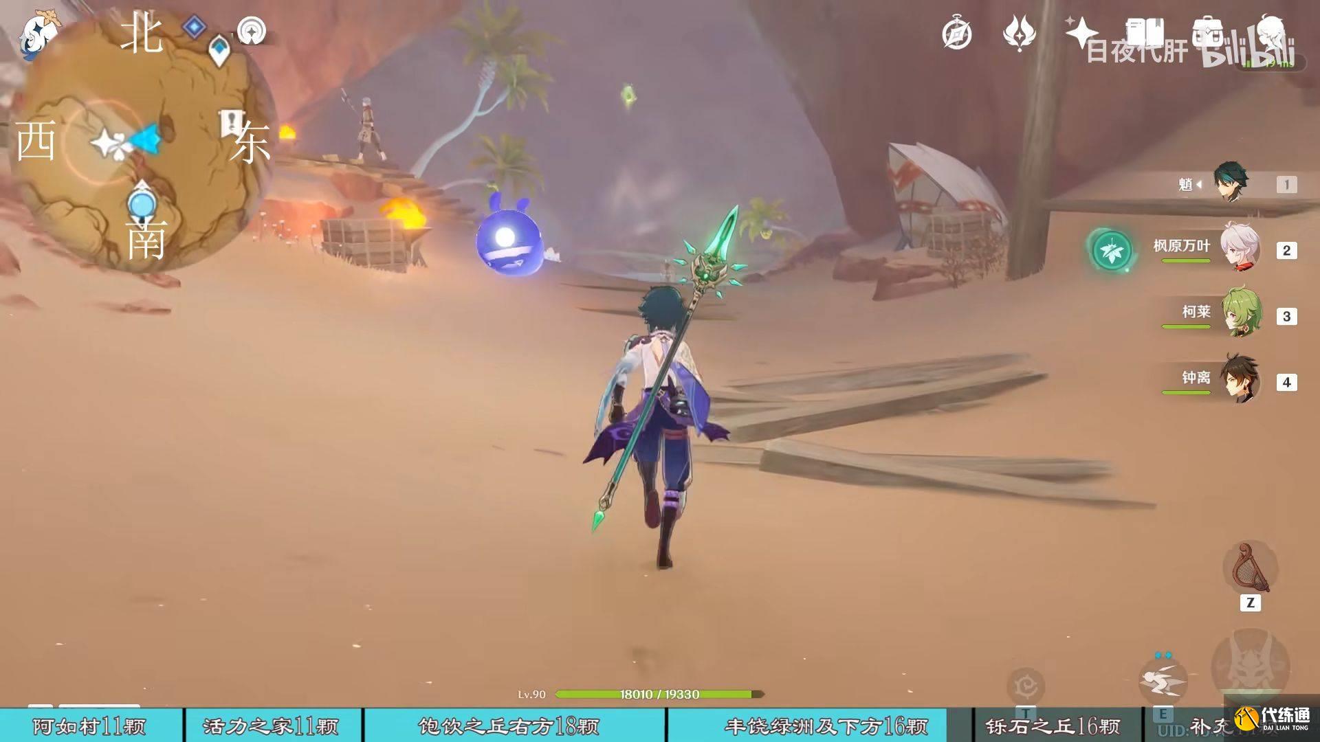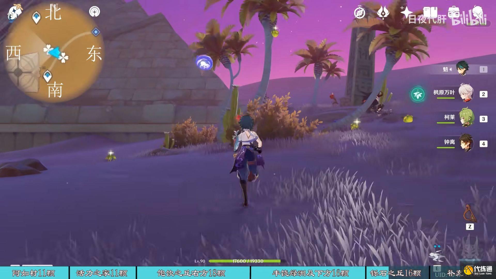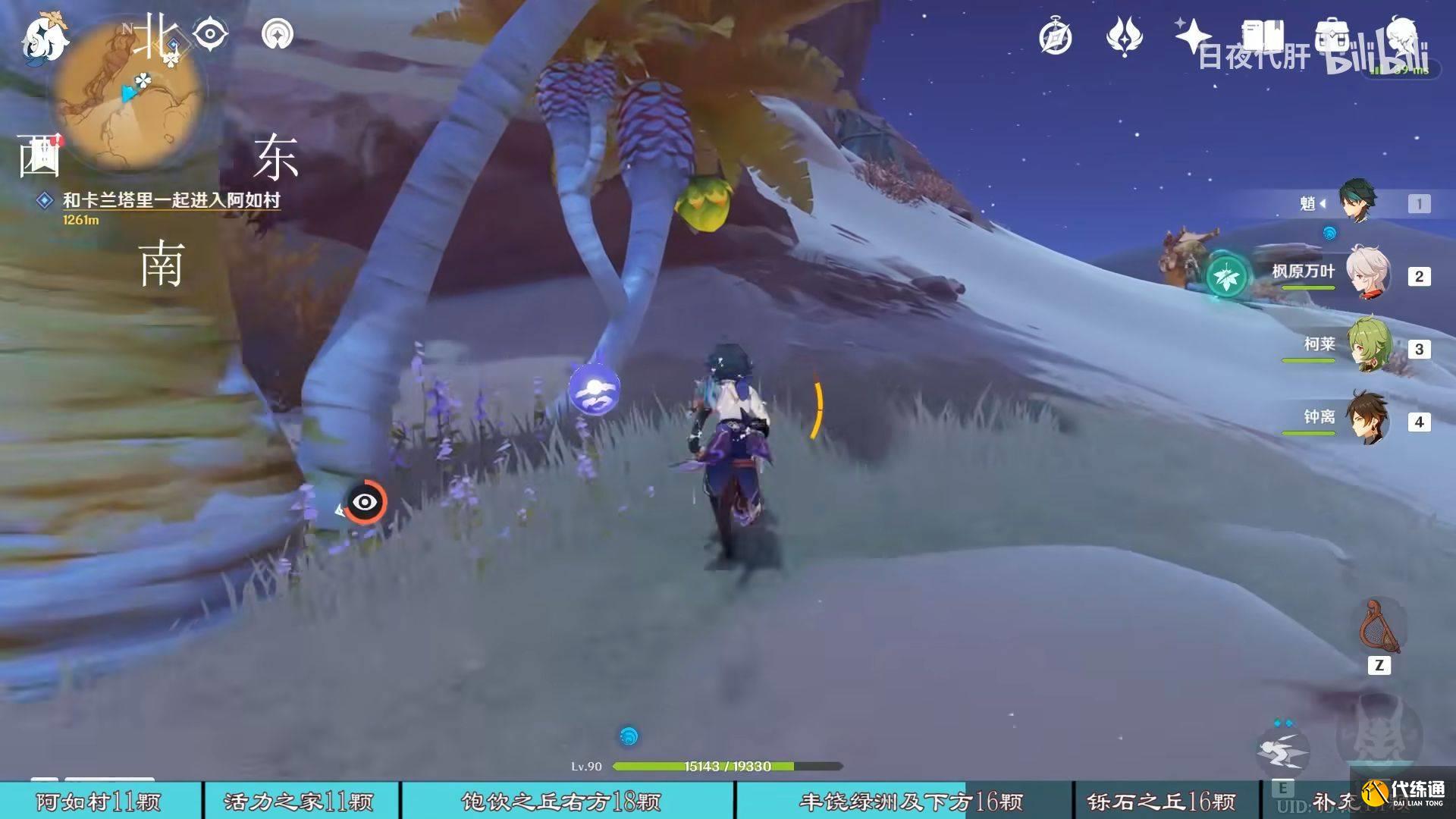 到饱饮之丘右下方的七天神像,西北方向走 用四印叶勾过去,北方向往上看有四印叶,勾过去。是个到左上绿洲的捷径。