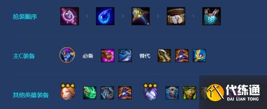 分析:主C索尔:无尽之刃+珠光护手+巨人捕手,因为有三魔导师的羁绊加成,我们这套阵容是不需要回蓝装备的,只需要把输出上限提升到最高即可;那么在装备中我们可以选择无尽之刃+珠光护手的搭配,也可以选择巨人捕手+班克斯的魔法帽,具体根据装备库实际情况选择即可 辅助位萨勒芬妮:莫雷洛秘典+朔极之矛+大天使之杖,萨勒芬妮必备莫雷洛秘典和朔极之矛,芬妮的技能附加伤害是可以触发莫雷洛秘典的重伤效果,因此我们这套就等于是全体带上了重伤效果;其次朔极之矛的效果是为了更快更高频率的释放技能护盾,毕竟阵容中没有续航装备的加持,就需要高额的护盾来提高容错 主坦塞拉斯:圣盾使的誓约+狂徒铠甲+石像鬼石板甲,塞拉斯最佳是有圣盾使的誓约,其余的防御装看实际情况合成即可