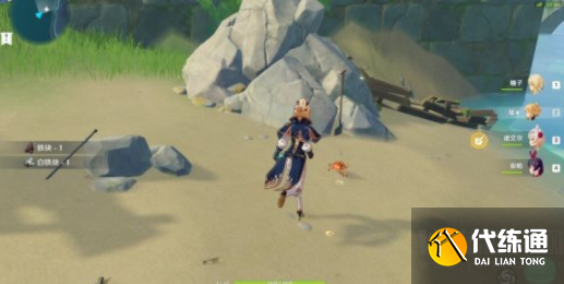 2、到达岛上之后直接往右走,可以看到一个帐篷和一处可以打碎的石块堆。