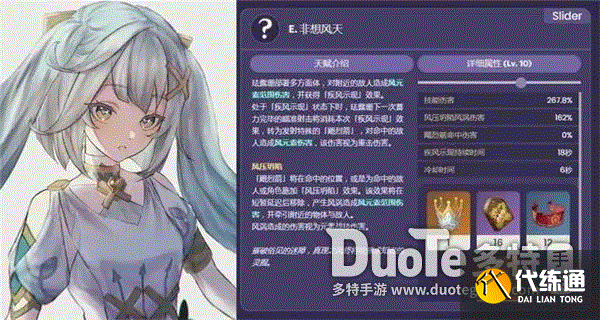 2、自身的输出能力也不错,作为风系队伍当中必要培养角色之一,大招技能可以对周围角色提升风元素伤害;