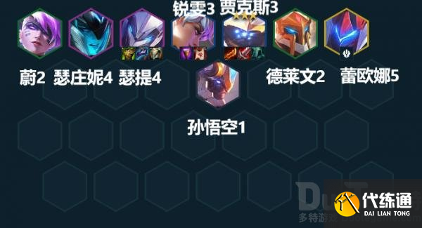 开局推荐上孙悟空、德莱文、波比组成2护卫1精英战士的阵容。肉装可以先给到波比,贾克斯的装备可以先给到德莱文。只要经济允许,我们可以快速拉5,这样的好处在于:一是能更早解锁三费卡的刷新,有利于我们抽到更多贾克斯;再来即使没有抽到贾克斯,也可以用3小天才2护卫1精英选手的阵容打工,保证前期血量健康。