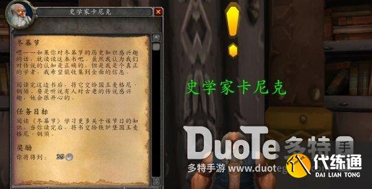 1、任务:冬幕节的意义部落到萨尔的房间,联盟到探险者大厅和NPC对话即可完成任务,随后又给一个任务“冬幕节”。