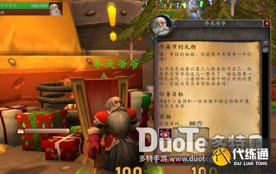 4、任务:冬幕节的礼物现从地精那里接一个任务去找冬天爷爷的,交完之后东西爷爷就会给你一个新任务“冬幕节的礼物”。