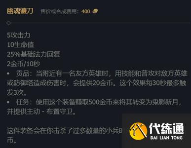 幽魂镰刀属于工资装之一,可以提供攻击力、生命值、基础法力回复以及金币,射手辅助时可以出。它可以通过赚取金币来升级,升级后可以放置侦察守卫。