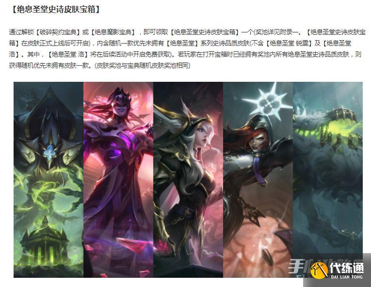 通过解锁【破碎契约宝典】或【绝息魔影宝典】,即可领取【绝息圣堂史诗皮肤宝箱】一个,内含随机一款优先未拥有【绝息圣堂】系列史诗品质皮肤。
