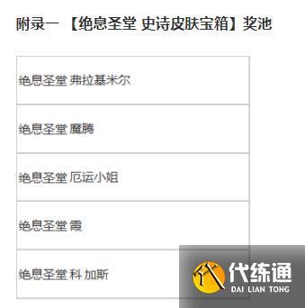 若玩家在打开宝箱时已经拥有奖池内所有绝息圣堂史诗品质皮肤,则获得随机优先未拥有皮肤一款。