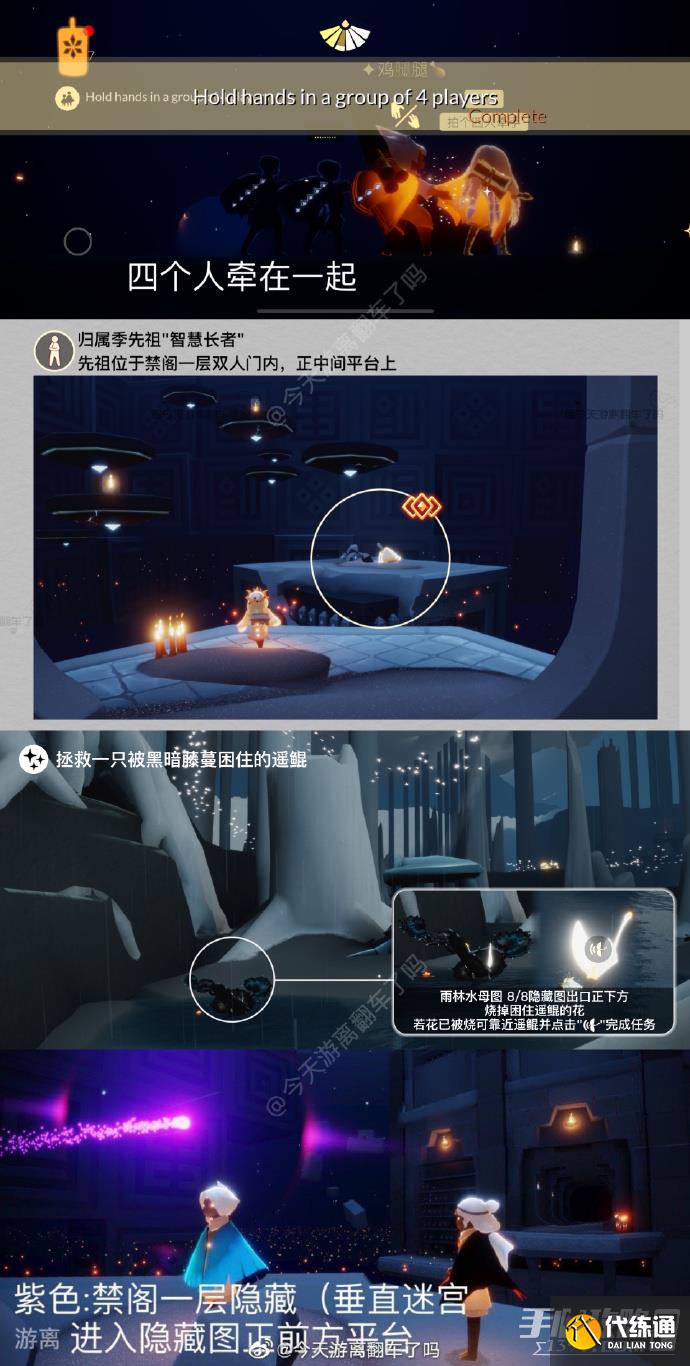 「四人牵手组队」四个人牵在一起,也可通过在表演季剧场右边洞口的火盆旁打坐重温季节任务完成。