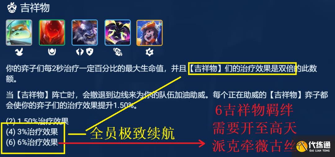 这套吉祥薇古丝属于续航流阵容,阵容搭配6吉祥物羁绊,全员都可获得每两秒回复6%最大生命值的效果,特别是吉祥物棋子还能获得双倍此效果(12%),让整体阵容续航能力直接拉满,对阵非高爆发阵容甚至可出现无减员的情况。