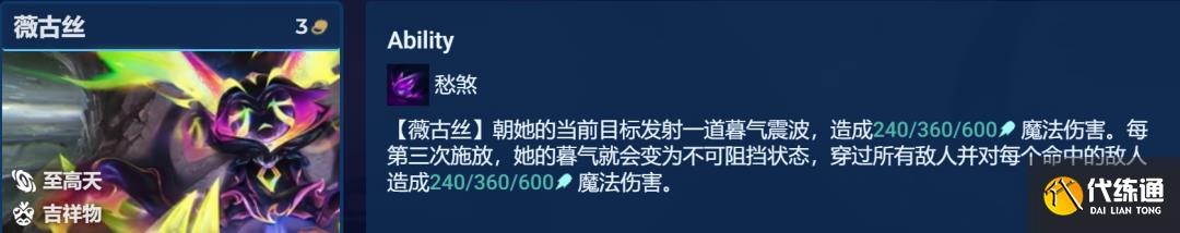 阵容主要输出就是薇古丝,其技能每第三次释放就能造成直线群体魔法伤害,3星薇古丝搭配,法强装输出轻松破千,对脆皮的敌方后排直接就可秒;更关键薇古丝只有40法力值,搭配法力续航装备技能释放频率快。