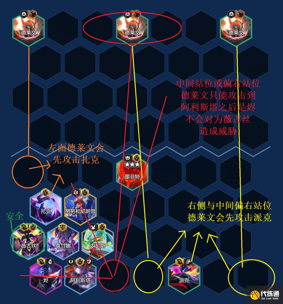 德莱文无论从哪里坐飞机,都不会直接攻击到我方主C薇古丝,薇古丝会非常安全,被攻击棋子扎克、阿利斯塔与派克,前两个棋子非常肉都有吉祥物羁绊特效,续航能力较高德莱文无法快速造成击杀,而德莱文打派克,派克会释放技能跑掉。