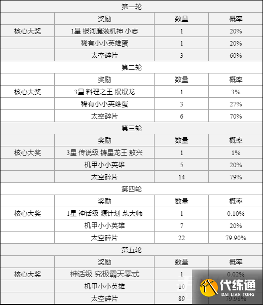 【太空夺宝】活动共分为五个轮次,当抽取到本轮核心大奖后, 则进入下一轮次,不再获得上一轮的其他奖励。在太空夺宝中,有概率获得神话级 【究极霸天零式】棋盘。