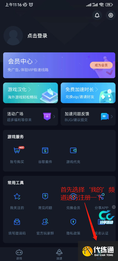 2、打开CC加速器,选择【我的】进行注册,只有注册后才可以使用;