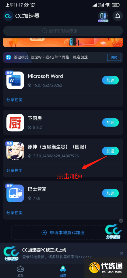 方法三、游戏未在本地区发布,所以进不去,可以尝试用《CC加速器》(点击下载)进行加速(推荐,可以快速登录)