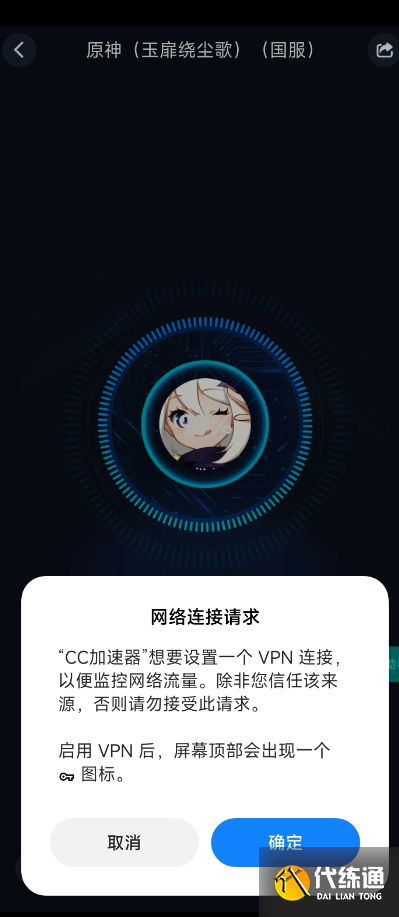 6、选择加速后,CC加速器会申请【网络连接请求】,同意才可以进行加速;