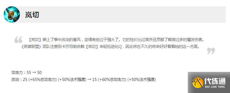 游戏《英雄联盟》上线了13.11版本正式服。在该版本中设计师针对岚切进行了削弱,一些玩家不知道13.11版本正式服岚切削弱了什么,小编给大家收集LOL13.11版本正式服岚切削弱一览,希望能帮到大家。