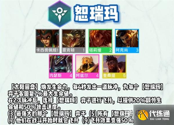 每4秒给恕瑞玛单位回血,回2次血后,会有恕瑞玛弈子飞升3恕瑞玛只有最强的那个会飞升,5恕瑞玛就是全体恕瑞玛飞升,等价老赛季的6龙神羁绊7恕瑞玛是开局飞升,9恕瑞玛是强化版飞升