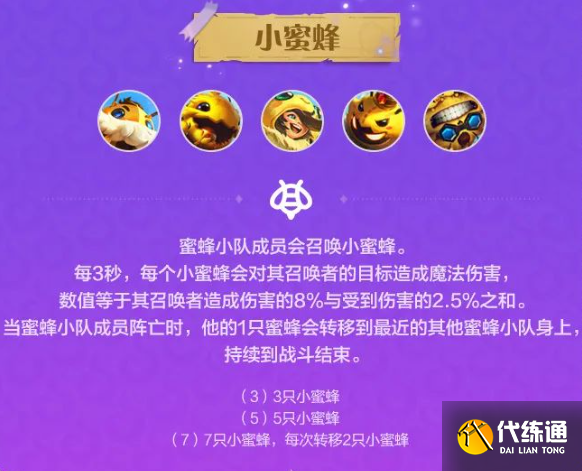 蜜蜂小队成员会召唤小蜜蜂。每3秒,每个小蜜蜂会对其召唤者的目标造成魔法伤害,数值等于其召唤者造成伤害的8%与受到伤害的2.5%之和。