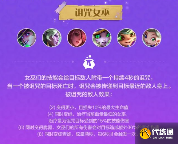 (4)同时变绿,治疗当前血量最低的女巫,治疗量为诅咒目标受到的15%的技能伤害