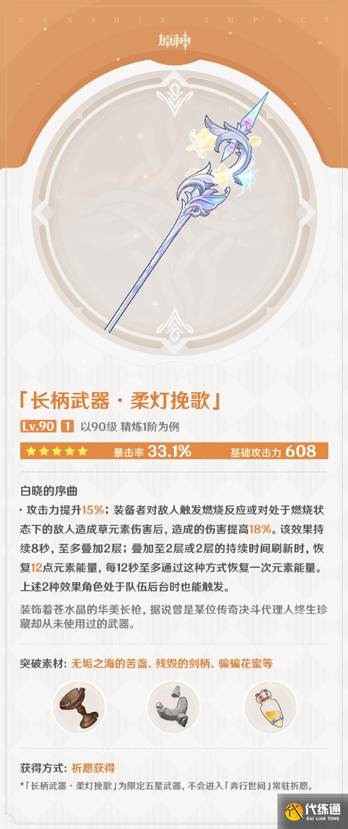 原神有很多武器可以获取,有限时获取与活动获取等,其中的柔灯挽歌是一把五星长柄武器,下面为大家带来的具体内容,感兴趣的玩家们千万不要错过哦!