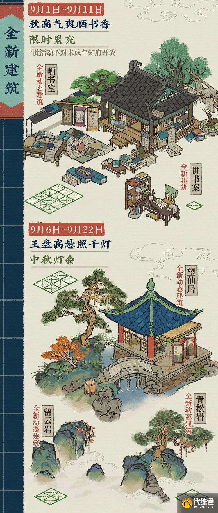 中秋灯会活动开启!参与活动收集「蟾宫月饼」,即可兑换全新2*3动态建筑「望仙居」、全新2*2动态建筑「留云岩」、全新2*2动态建筑「青松岩」等好礼。