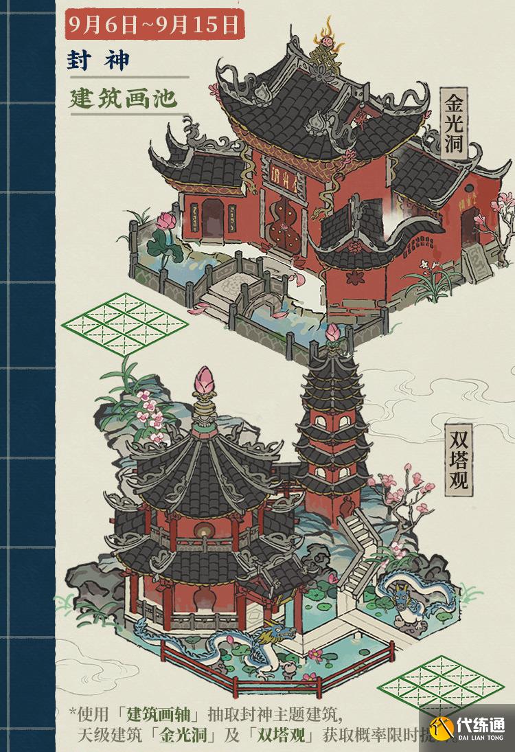 消耗「建筑画轴」即可参与画池绘画,有机会获得「金光洞」「双塔观」等封神主题建筑。