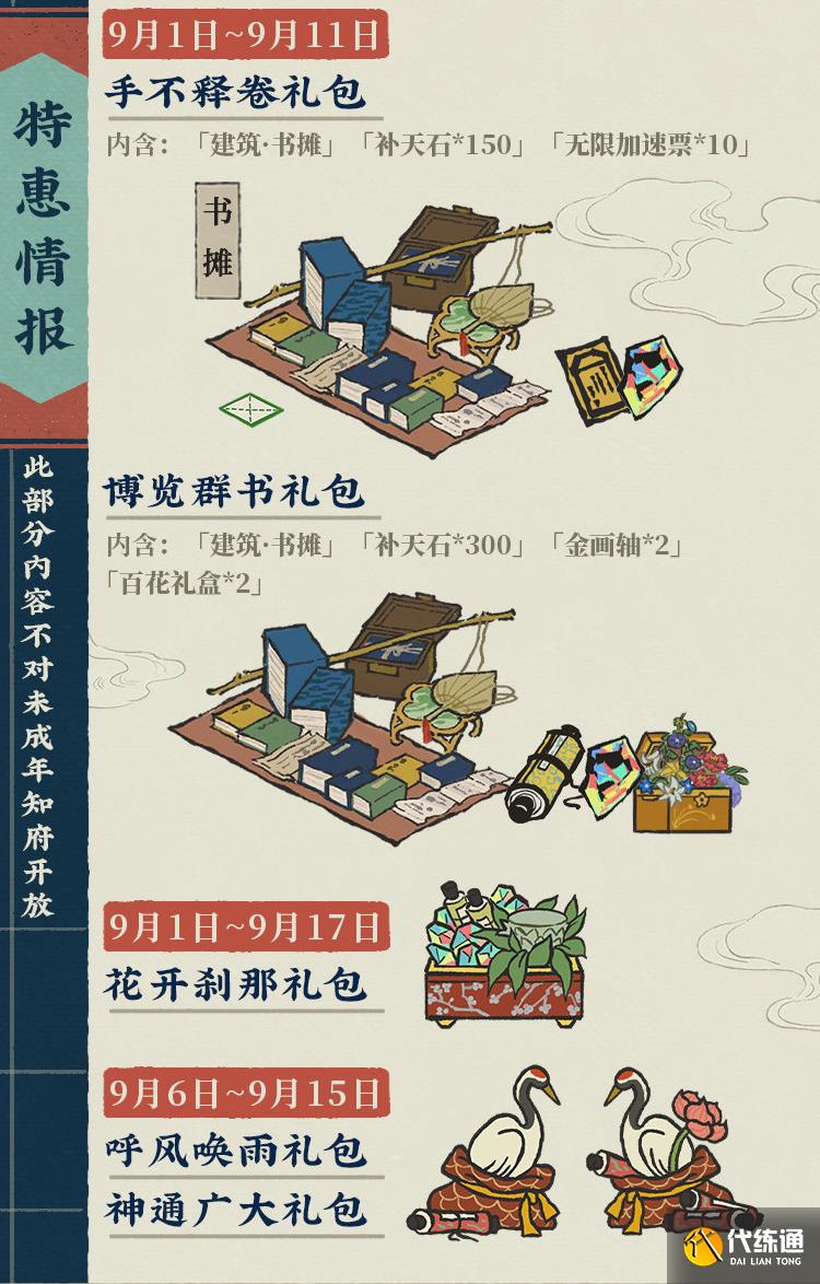<壹>9月1日11:00起,前往「签到-限时-开卷有益日日新」,可收获奖励「书卷残页」。