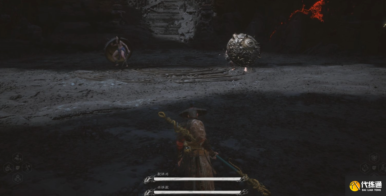 3、进门来到土地庙,先右拐走到头有个【打坐蒲团】,然后去左边打BOSS掀烘兴和兴烘掀。