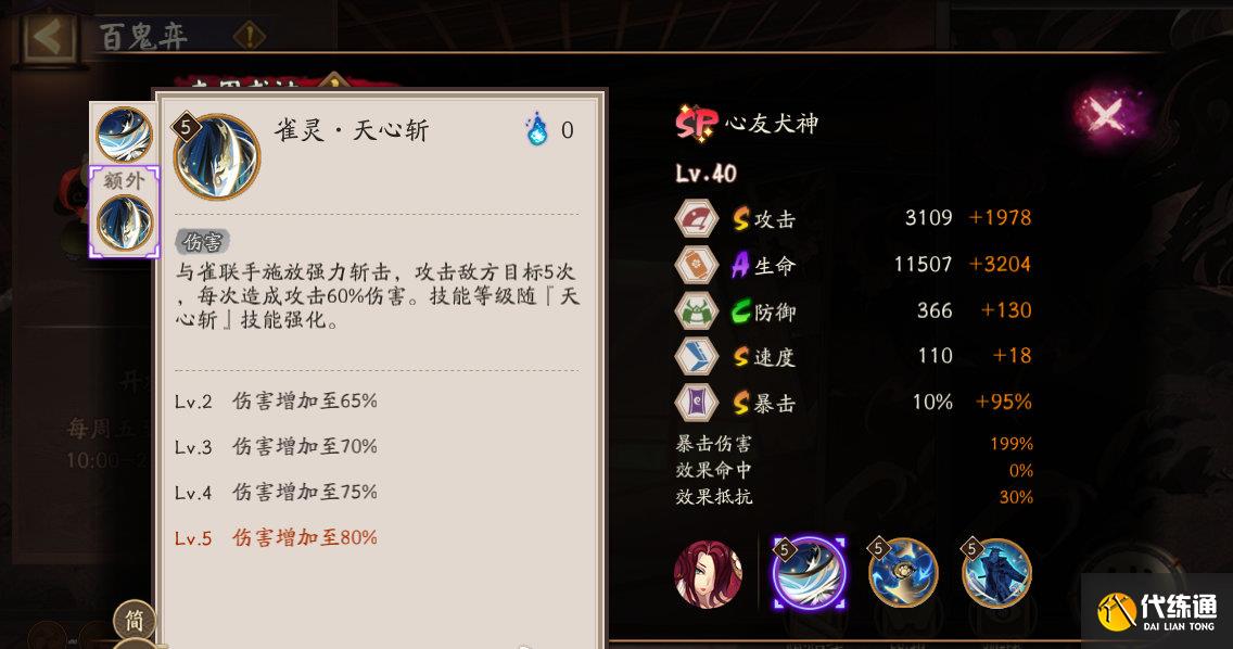 与雀联手施放强力斩击,攻击敌方目标5次,每次造成攻击60%伤害。技能等级随「 天心斩」技能强化。