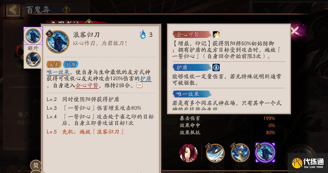 [增益,印记]获得阴阳师50%初始防御;拥有护盾的友方目标受到攻击时,施放「一誓归心」(自身回合开始前限3次)。
