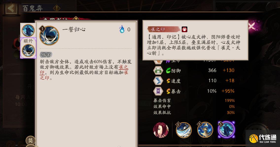 [通用,印记]被心友犬神、阴阳师普攻时增加1层,上限5层。叠至满层时,心友犬神立即消耗全部层数施放强化普攻「雀灵·天心斩」。