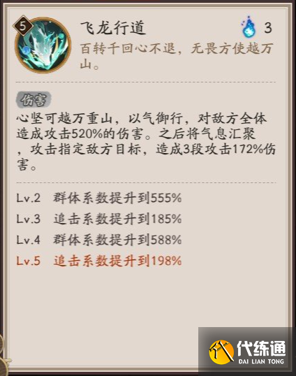 心坚可越万重山,以气御行,对敌方全体造成攻击520%的伤害。之后将气息汇聚,攻击指定敌方目标,造成3段攻击172%伤害。