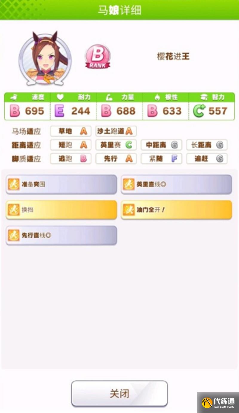 樱花进王的场地适应性主要集中在草地和泥地,跑法建议选择逃跑或先行。在技能加点方面,专注于提升速度相关的技能即可。作为一星马娘中的佼佼者,她在中短程比赛中能发挥出惊人的实力,特别适合新手训练员用来攻克URA赛事。