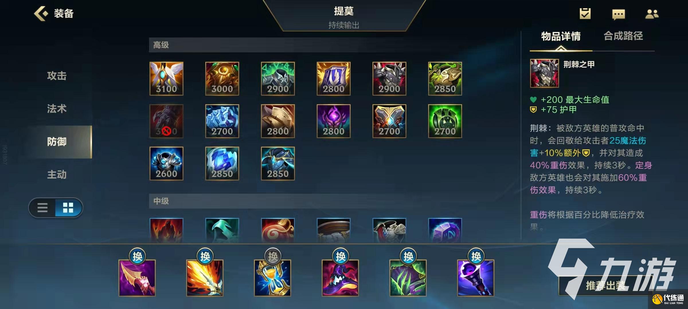 上单大多都是坦克或者半肉战士,既然都少不了出肉装,那么玩家第一次回家可以直接裸一个小反甲。小反甲不仅有高额的护甲加成,还能反弹对手一定的伤害同时对目标造成重伤效果。玩家在出了护甲装备后在选择自己的核心装备,一般有了护甲装备更容易抗压。后续装备像兰顿、布甲鞋都是收益很高的,坦克英雄克制直接护甲到底。