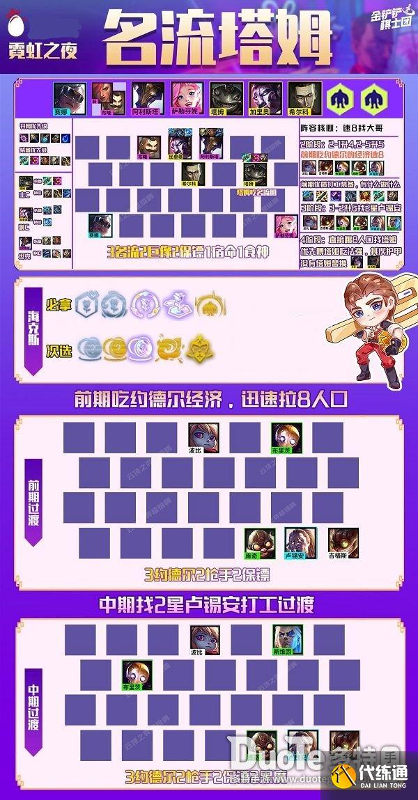 8.运营思路:这是一套速8找塔姆的阵容,因此阵容的运营非常关键,当前版本正常的情况下前期选择约德尔体系打工,中后期在4-3/4-5直接跳8人口去找塔姆,如果经济好的情况下,甚至可以在4-2直接跳8人口找塔姆。Q:为什么前期优先考虑约德尔阵容过渡?A:约德尔保镖抢,核心点在卢锡安。卢锡安拿电刀、海克斯科技枪刃等输出装都非常强,这是前期连胜的关键。约德尔能够提供约德尔英雄,到4阶段大概能够提供10-20金币的收益,基本会比别人提前1-2个回合拉8人口,更容易找到塔姆。